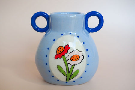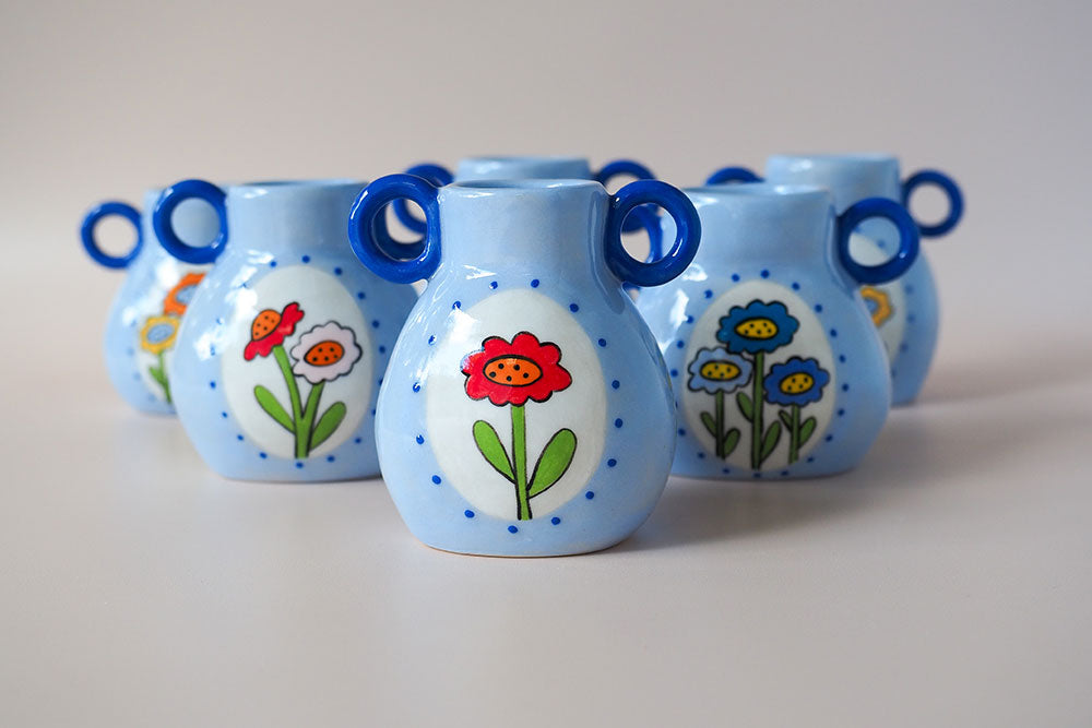 The Garden Floral Bud Vase is hand-built using midfire clay, underglazed and gloss glazed for shine and strength. The shape and design are organic in nature. Each bud vase is functional and lovingly handmade, and hand painted with original designs by Kathy Gardiner using brush underglazes.