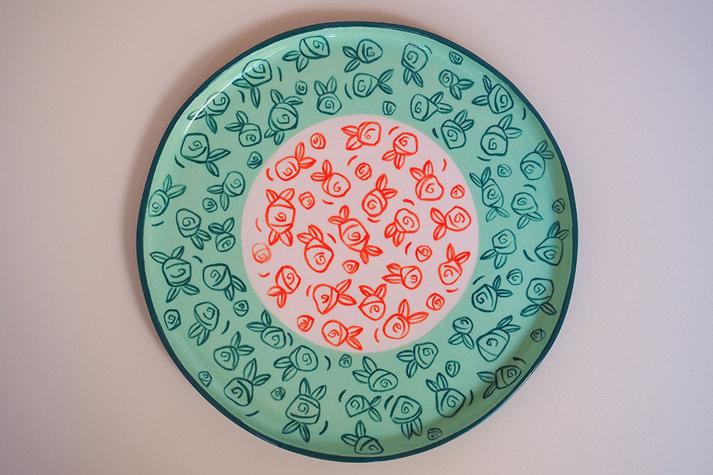 The Rosa Plate - Medium is hand-built using midfire clay, underglazed and gloss glazed for shine and strength. Each plate is lovingly handmade and hand painted with original designs by Kathy Gardiner using brush underglazes. Every plate within the collection is designed to add a little romantic nostalgia to your setting.