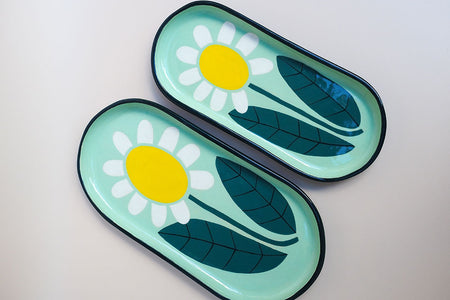 The Sunshine Daisy Oblong Platter - Small is hand-built using midfire clay, underglazed and gloss glazed for shine and strength. Each platter is lovingly handmade and hand painted with original designs by Kathy Gardiner using brush underglazes. Add a little sunshine to your day!